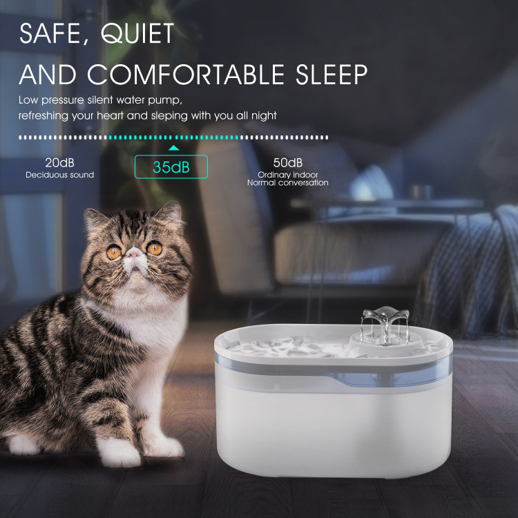 با این آبخوری هوشمند، نوشیدن آب برای حیوان خانگیتان راحتتر، سالمتر و جذابتر میشود. جریان آرام و مداوم آب باعث میشود آب کمتر ساکن بماند و حیوان تشویق شود بیشتر بنوشد — این امر به سلامت کلی آن کمک میکند. پمپ طراحی شده بسیار کمصدا است، بنابراین هنگام شب یا زمانی که حیوان در کنار شماست، مزاحمتی ایجاد نمیشود.